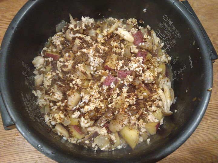 6. 炊飯器に米を入れ、2合の目盛りまで水(分量外)を入れる。その上に、5と調味料をすべて加えて軽く混ぜ合わせたら炊飯スタート。