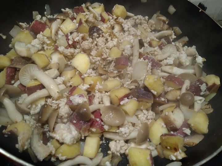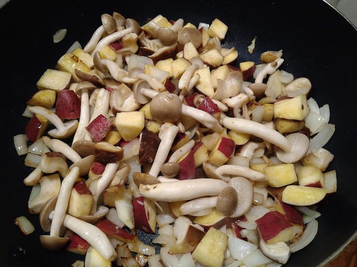 4. フライパンにオリーブオイルを引いて、玉ねぎ、しめじ、しいたけ、さつまいもを炒める。
