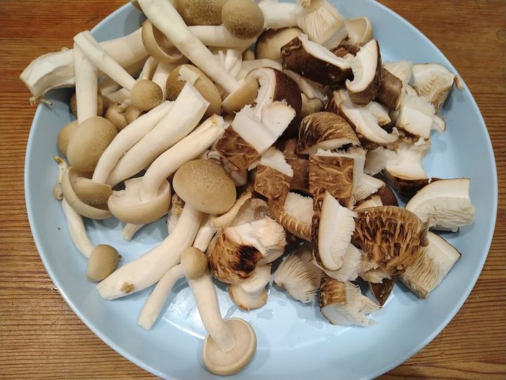 2. しめじは石づきを落として小房に分け、しいたけは軸を取って大きめのさいの目切りにする。