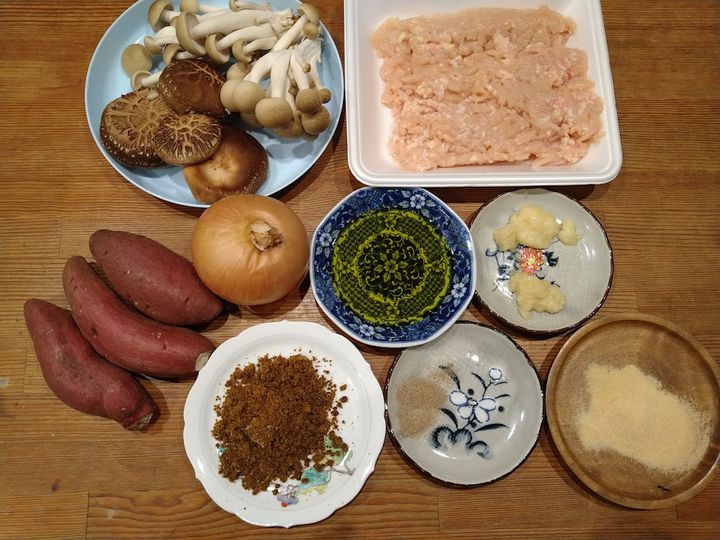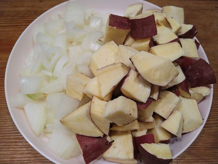 1. 玉ねぎを粗みじん切りにする。さつまいもは、皮が付いたまま2cmほどの角切りにして水にさらす。