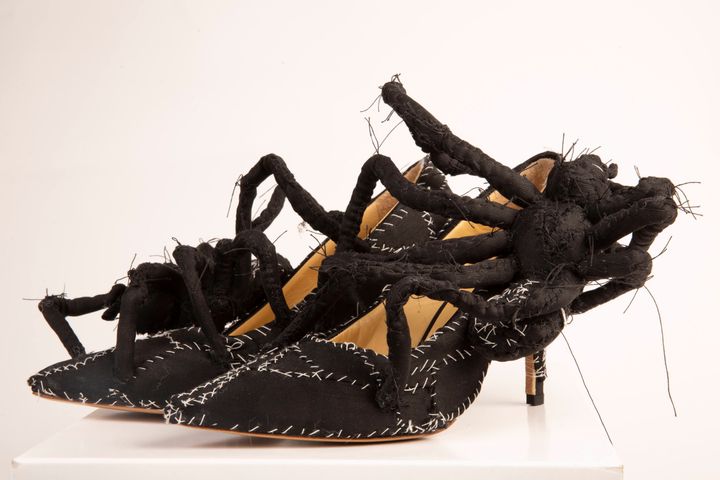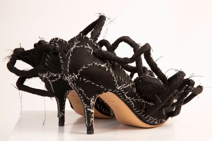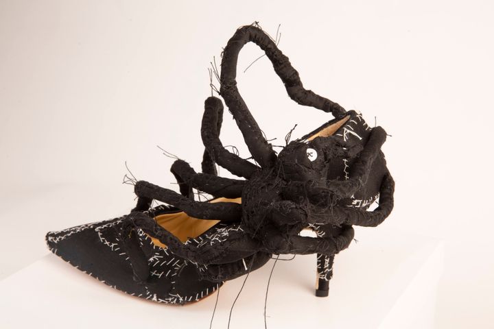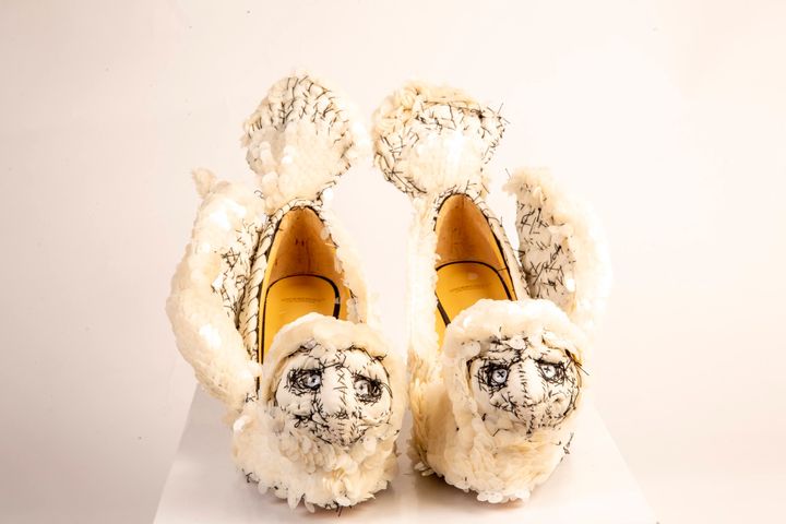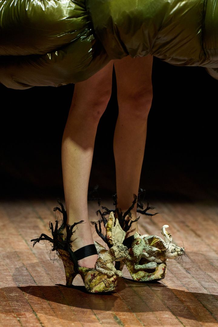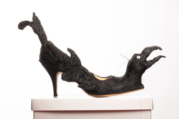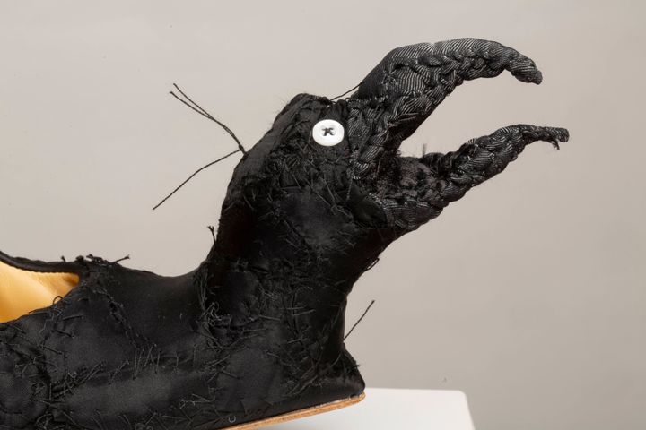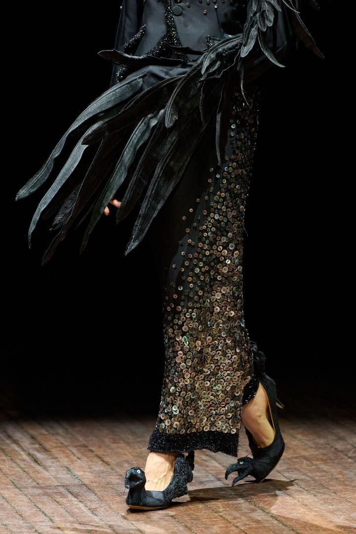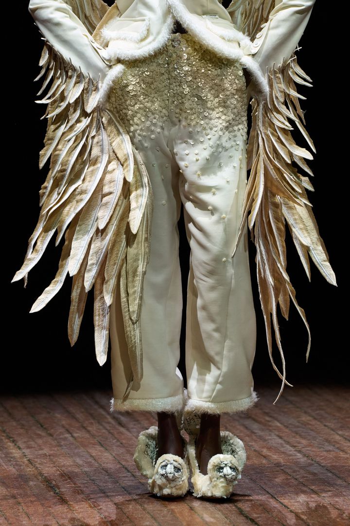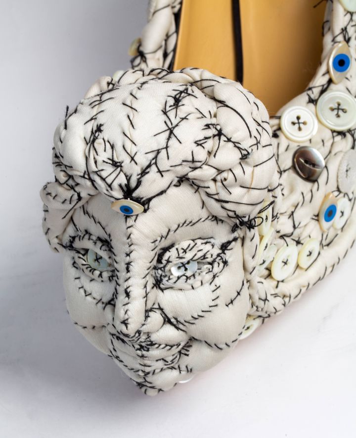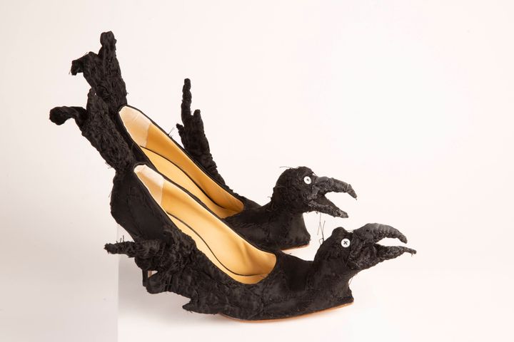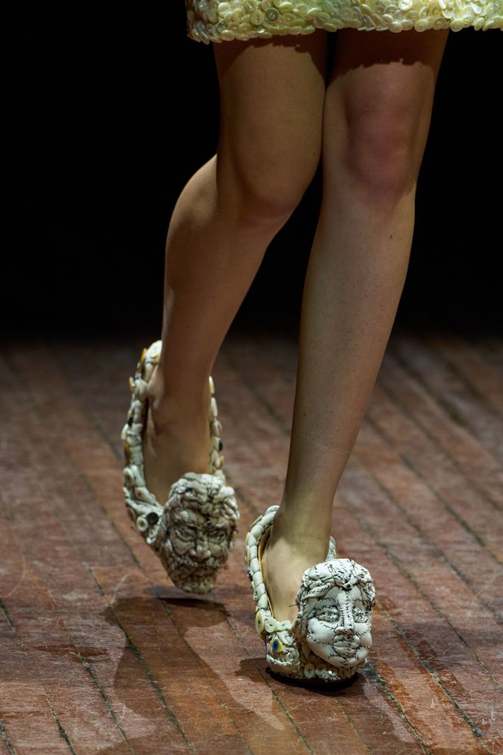 盾は私の作品とパティ・スミスにインスパイアされたと話していました。パティと私の名前を並べるなんて、今でも照れてしまいます。ショーのためのアクセサリーを作るように依頼されたのですが、彼はコレクションに使うものと同じファブリックをたくさん送ってくれました。私はいくつかのマスクや靴を彼に提案したのを覚えています。彼はそのなかから、メインとなるシルエットを数点ほど選びました。私には創作の自由があったのです。カラスとフクロウは、彼が選んだものだと思います。唯一の条件は、モデルが歩けるようにすることでした。作品を作るのはとても楽しかったですね。スカルの形をしたハンドバッグも作りました。また、ステージを縁取る巨大なパッチワークなど、装飾も手がけました。