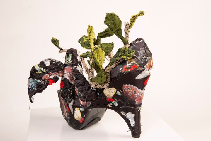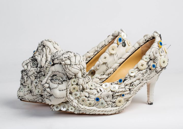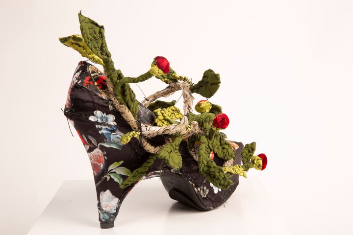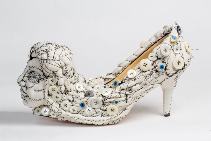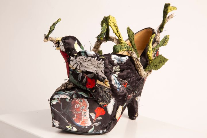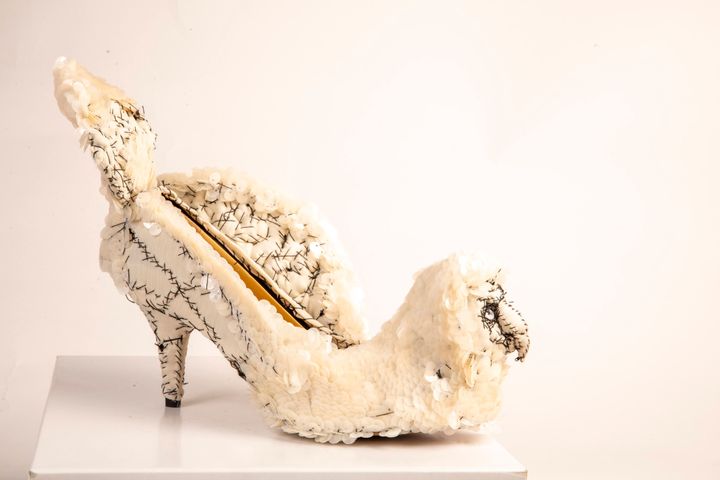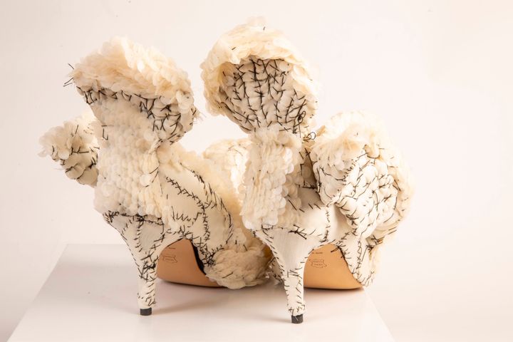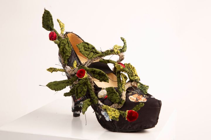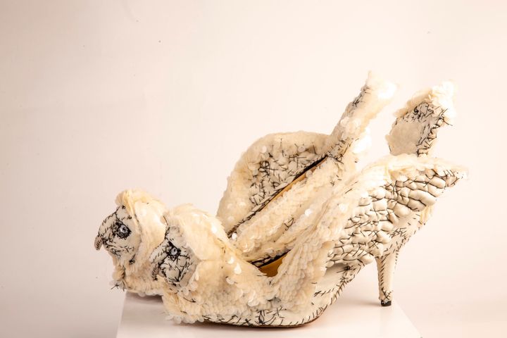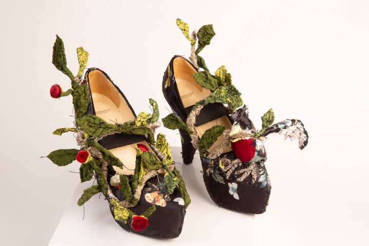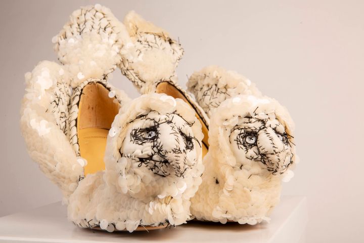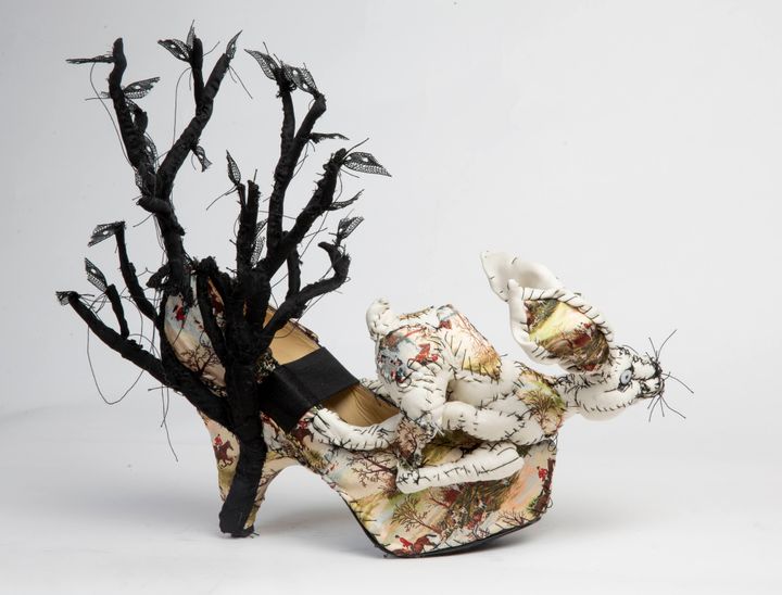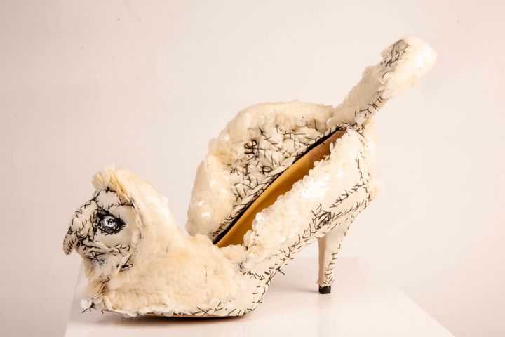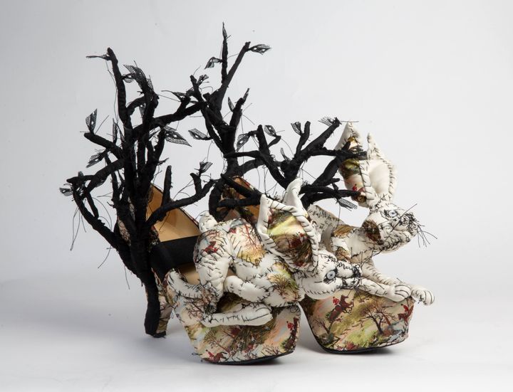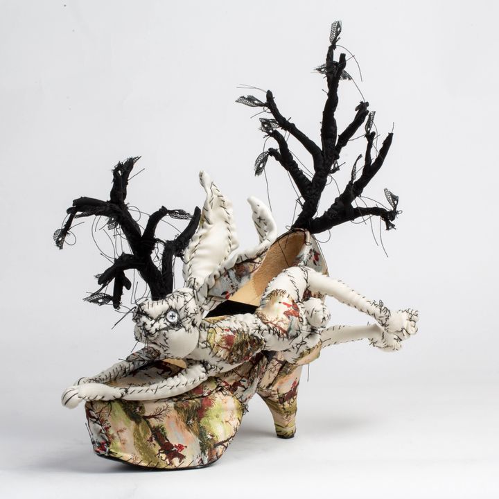 ウサギの靴。かかと部分には木の装飾が配され、ひとつの世界が描かれている。
