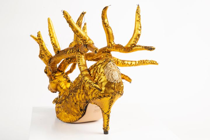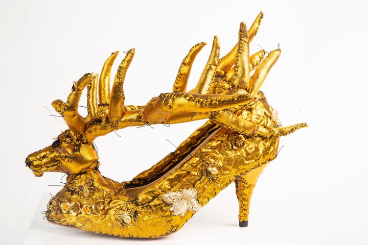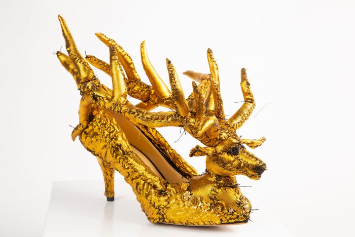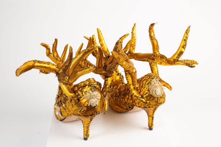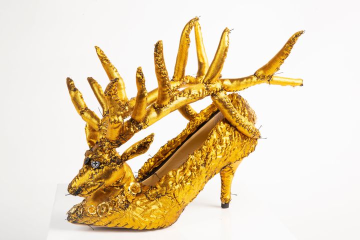 デュポンがアンダーカバー 2025-26年秋冬コレクションのために手がけた、鹿をモチーフにしたゴールドのシューズ。