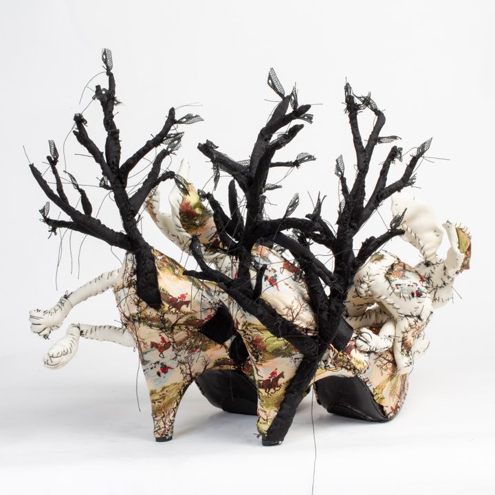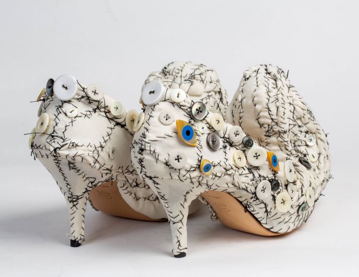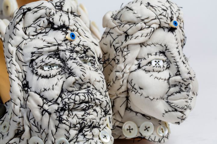 リサイクル素材を使うのが好きで、生地はたいてい蚤の市で見つけたものです。生地にストーリーがあるというところが気に入っています。着古した服を切って使うことも多いですね。魂がこもっている気がします。私の作品は子ども時代の傷や、その傷を癒したいという願望を描いたものです。裁縫を取り入れることで、縫い合わせることができる。また、裁縫は女性の伝統でもあります。ですから、芸術における男性優位をユーモラスに非難するためにも使っています。私は伝統的な彫刻を、女性の手仕事を連想させるような素材で見直すのが好きです。(特徴を大げさに強調して描く)カリカチュールの要素やユーモアをよく織り込んでいます。