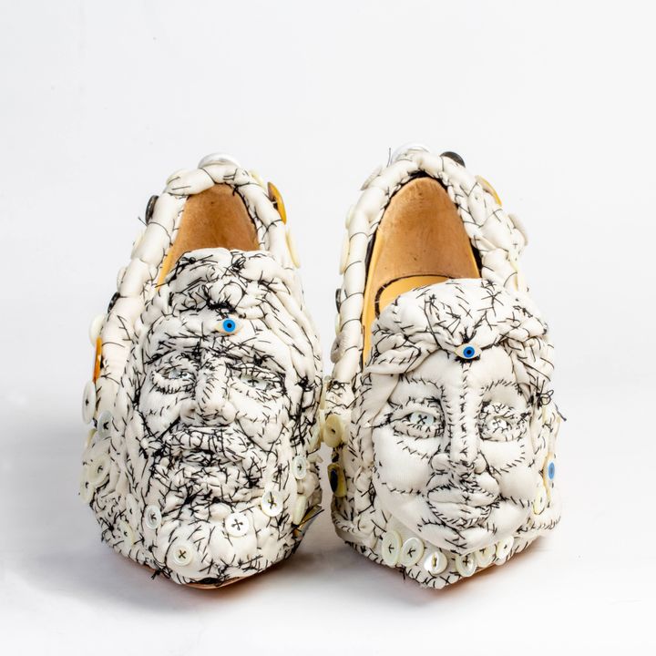 盾は何も説明してくれなかったんです! ただ、彼がアンダーカバーの35周年に向けて、「But Beautiful」コレクションにオマージュを捧げたいと考えていることだけは知っていました。私は7足の靴を作ったのですが、ショーの前日、盾に壮麗なゴールドの衣装を完成させるためにスカルバッグを作ってほしいと依頼されました。彼は私に完全な自由を与えてくれましたね。彼の私に対する信頼は、言葉にできないものです。とても光栄なことであり、大きなプレッシャーでもありました。彼は私にベースとなる靴とコレクションからいくつかの生地を提供してくれました。ただひとつ与えられた指示は、それぞれの靴に特定の生地を使わなければならないということ。ひとつ試作してみて、自然とコレクションのテーマを掴むことができたので、ほかの靴をデザインする自信が湧きました。靴と衣装の繋がりには、言葉を失うほどの感銘を受けます。