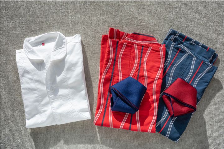 ナイトウエアにもこだわりがたっぷり。まず左側、エジプト綿100%のパジャマはホテルオリジナルで、綿でありながらまるで絹のようななめらかな光沢があり肌になじみます。丁寧に縫われた美しい形のシャツとズボンで、体にジャストフィットするくらいのサイズ感。