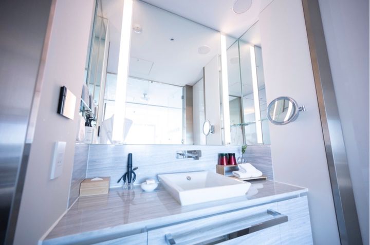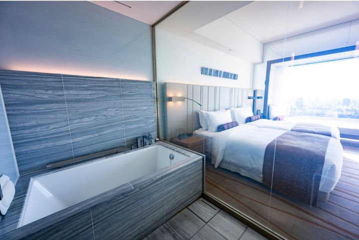 壁面のガラスはスイッチひとつですりガラスに切り替えることができるので、プライバシーも確保できますが、できればこの開放的な雰囲気のまま楽しみたいところ。窓の外の夜景を眺めながらのバスタイム……素敵ですよね。