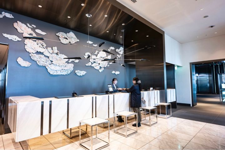 チェックインをするレセプションはこちら。壁面を飾るのは雲をイメージした『雲中庭園』というアート作品で、モノトーンのレセプションに調和しながら、東京上空に浮かぶ特別な空間へ招かれたような浮揚感を演出しています。