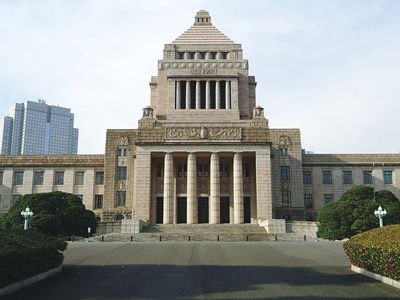 日本の政治の中心である国会議事堂。正面向かって右が参議院、左が衆議院。大正9年(1920)の着工後、17年もの歳月をかけて昭和11年(1936)に完成しました。地上3階(中央部分4階)、地下1階の鉄骨鉄筋コンクリート造りで、長さ約206m、奥行き約89m、中央塔の高さ約65m。建物には全国から集められた3万トン近くの花崗岩や大理石が使われ、延べ254万人もの人々が携わりました。見学は衆議院・参議院ともに予約なしで無料見学が可能。いずれも本会議場や御休所、中央広間、前庭などを見て回ることができます。詳細は各公式サイトで確認。