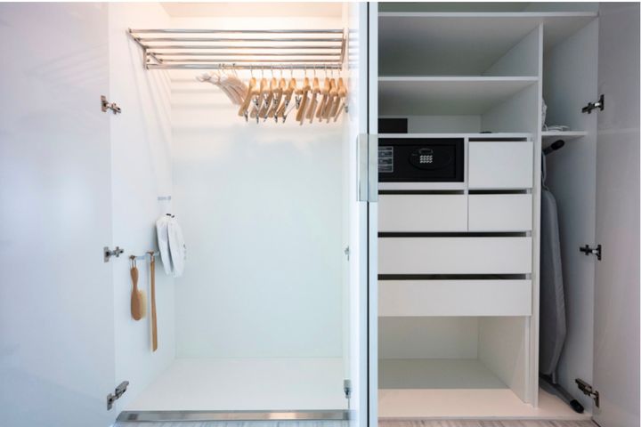 収納スペースもこの充実ぶり。ハンガーラックにはたくさんのハンガーが用意されているうえ、下が引き出しになっていないのでロングのワンピースやアウターをかけやすいです。撮影のために扉を開いた状態ですが、右のハンガースペース、左の収納棚ともにそれぞれ扉がついています。