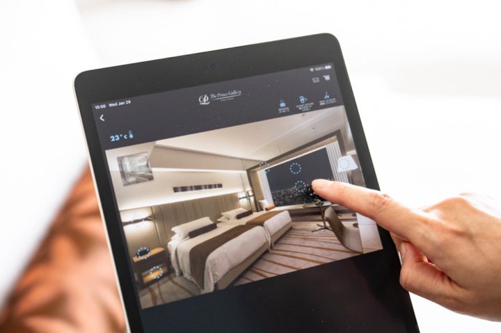 この客室には上質でおしゃれなアイテムが揃っているだけでなく、最新技術も備えられています。なんと備え付けのタブレット上で客室内の照明やカーテンの操作ができます。客室画像の青い丸の部分をタッチするだけで、その部分の照明が点灯・消灯したり、カーテンが開閉できたりする優れもの!