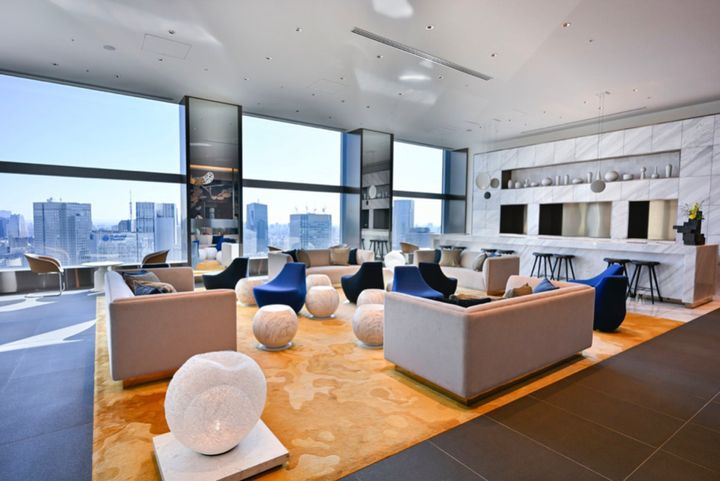 レセプション前のロビーラウンジ は、東京を一望する景色をバックにモダンチェアを集めた都会的でハイセンスな空間です。プライベート空間の客室ではなく、カフェやレストランでもない場所で、腰かけて話したりするのにぴったりの心地よいスペースになっています。