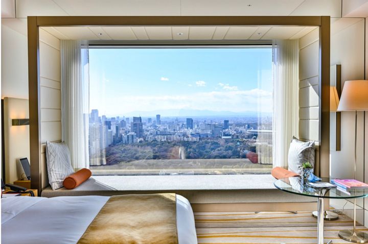 見てください、この絶景。デラックスタイプの客室は、窓枠のデザインが額縁のようになっていて、まるで絵画を鑑賞するように時間によって表情を変える東京の景色を眺めることができます。デイベッドに座って窓の外を眺めるのんびりとした時間は、このホテルに泊まる大きな魅力の一つです。