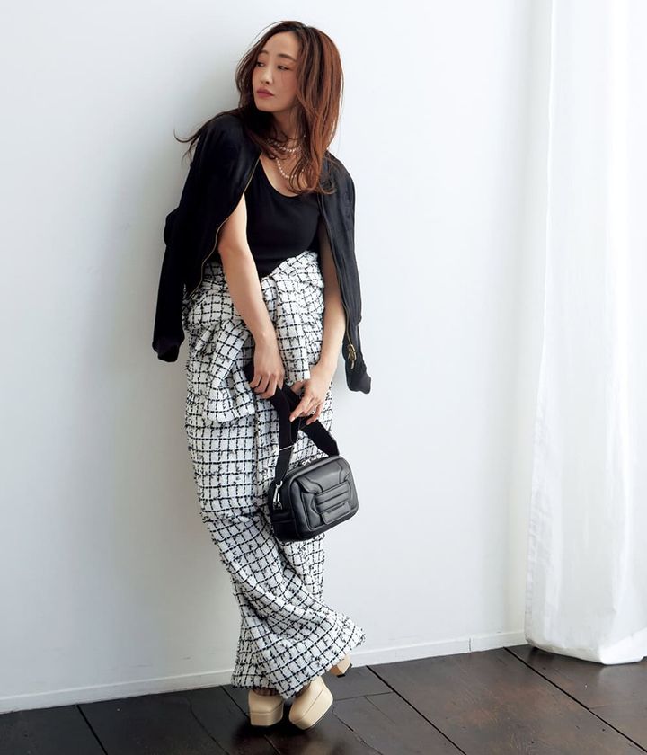 クロシェカーディガン¥132,000(ブソル/エストネーション グランフロント大阪店)P.3.ツイードオールインワン¥469,700タンクトップ¥34,100ブルゾン¥275,000(すべてマディソンブルー)バッグ¥172,700(ピエール アルディ/ピエール アルディ 東京)靴¥123,200(セルジオ ロッシ/セルジオ ロッシ カスタマーサービス)パールネックレス[短]¥101,200[長]¥99,000(ともにビジュードエム/ビジュードエム六本木ヒルズ)