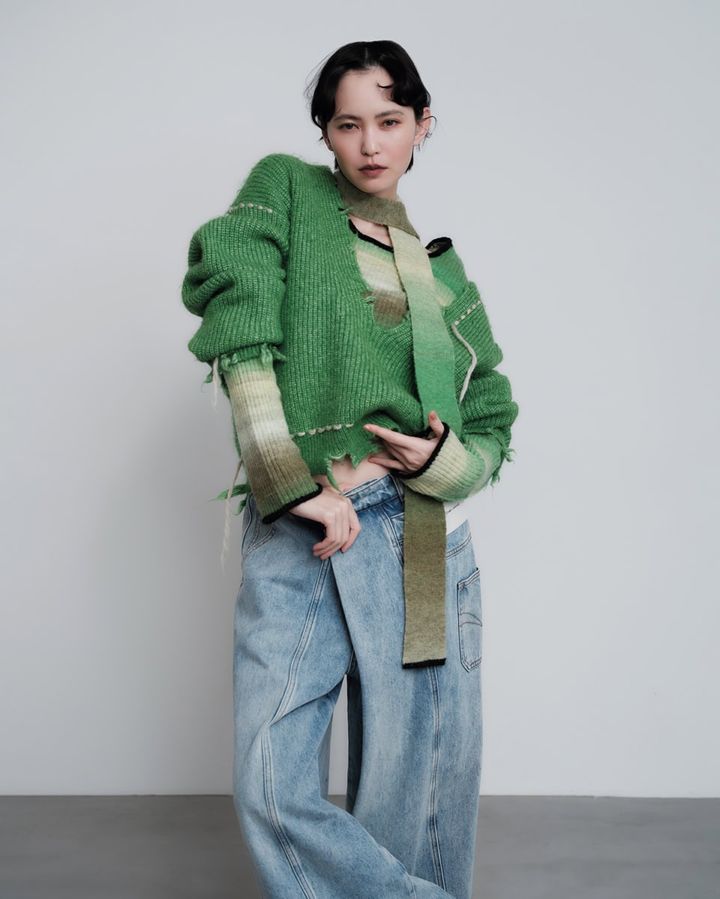 Vネックニット¥16,940、中に着たマフラー付きニット¥16,940(共にメゾンスペシャル/メゾンスペシャル 青山店)、デニム¥72,500(フェン チェン ワン/エッセンス)