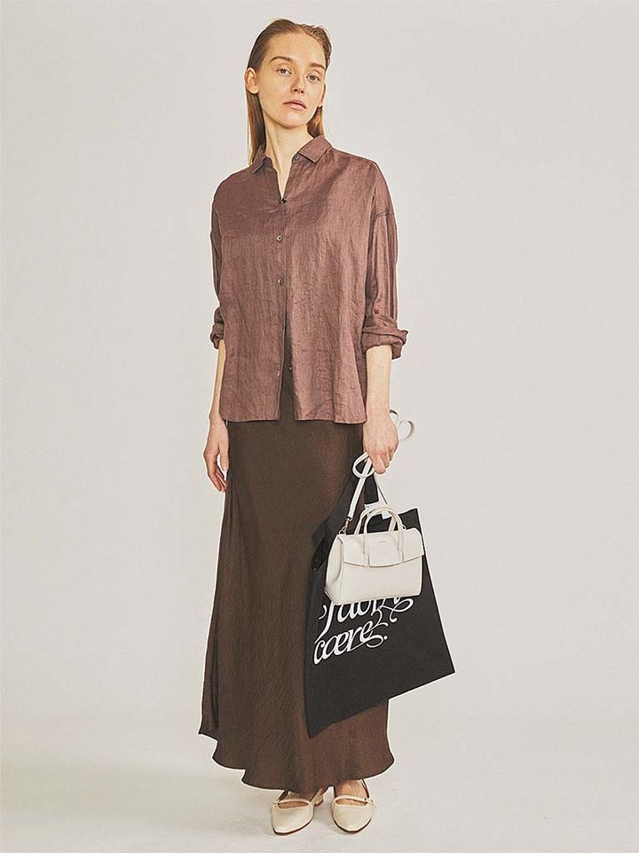 さらっと着られる、清涼感のあるフレンチリネン素材。ほどよい光沢感のある質感が、こっくりとしたブラウンをのっぺり見せず、自然と奥行きのある見た目に。丈は長すぎず、ほどよくワイドな身ごろでボトムを選ばず羽織りとしても重宝できるデザイン。