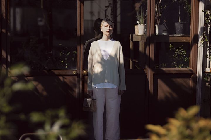 ルーズなトップスどうしも、深く広く開いたシャープな首元で背筋が伸びた印象に。ニット素材で選べば、淡色+ゆるいシルエットのやさしいスタイリングと調和する。