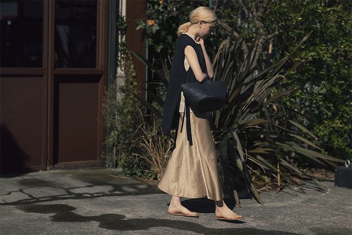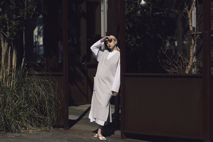 両サイドのスリットや前後差のある丈もレイヤードにはもってこいの形。すそまわりに余白が生まれるデザインでフレアスカートともすっきりまとまる。縦に流れるシルエットの、強弱をつける役割にも。