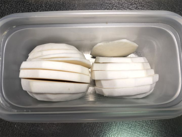 1. かぶを2~3mm程度にスライスして、深めの保存容器に入れます。