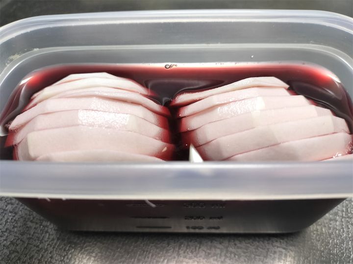 2. 山ぶどうジュースを注ぎ、冷蔵庫で一晩漬け込みます。