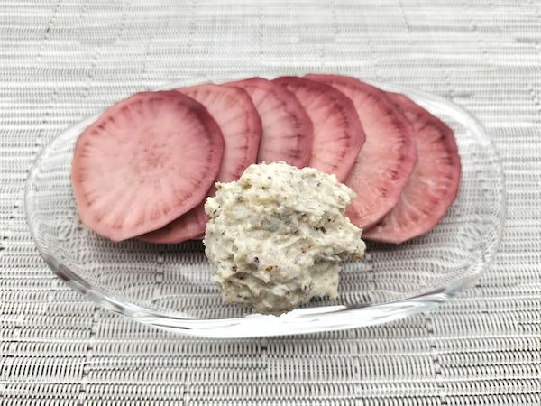 思ったよりは色が薄い仕上がりです。ちょっとかじってみると、かぶ本来の甘さに加えて山ぶどうジュースの香りと酸味がほのかに感じられました。ちゃんとかぶの食感も残っていますし、このままでも好きな味です。そこに鬼ぐるみソースを乗せて食べてみると、生クリームを使っているのにしつこくなく、砕けた鬼ぐるみの食感と味が山ぶどうジュースの酸味ととても相性がいいことが分かりました。少し多めに鬼ぐるみソースを乗せる方が、わたしにはよりおいしく思えました。塩と生クリームの正確な量が分からないので少しずつ生クリームを入れながら固さの調節をしましたが、ちょっと柔らかめのクリームチーズ程度の固さが鬼ぐるみの味が損なわれなくて、バランスがいいように感じます。