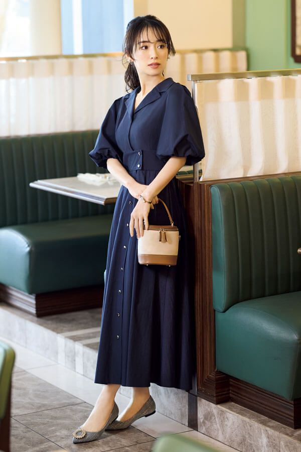 フォーマル感で相手への敬意を表せるのが、ネイビーの強み。派手に見えないシックな装いが、ご両親にとって安心材料に。テーラード襟からデコルテが品よくのぞくワンピなら、適度な抜け感が出て重見えしません。愛らしいふんわり袖で、フレッシュな可愛げも印象づけて。