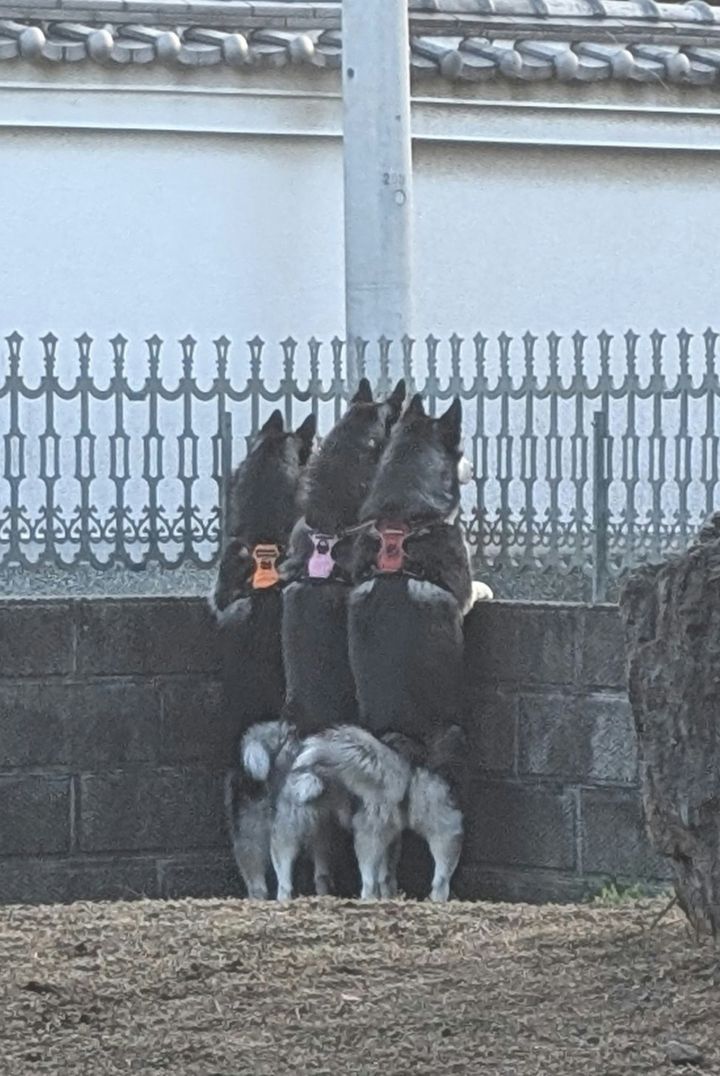 3. 【可愛すぎ注意】塀からひょっこり!ハスキー3姉妹のぞき見姿に2.7万いいね爆笑