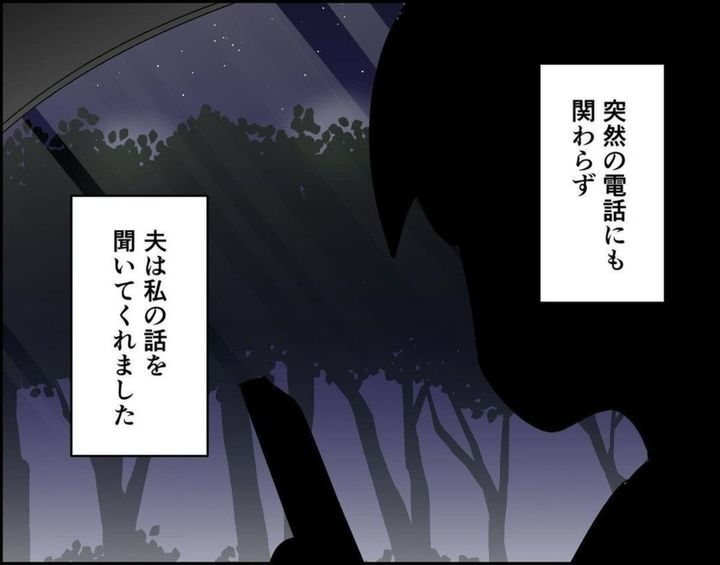 お店をでたあと、セミさんはまっすぐ帰る気にならず、実家近くの公園へ…。今日のことを思い返し、ひとしきり泣きはらします。そして、今のツラい思いをひとりでは抱えられないと感じ、夫へ電話をかけます。