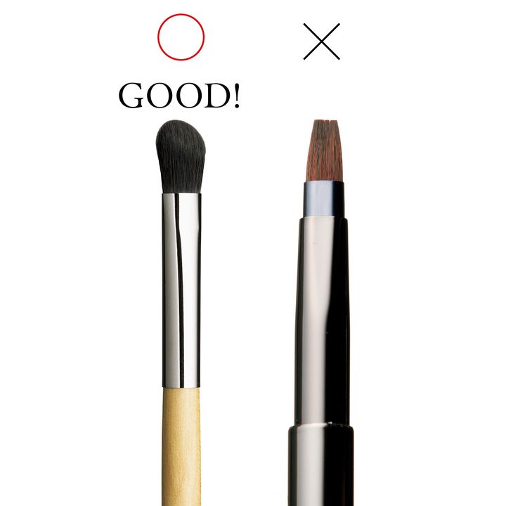 マットリップは平筆でくっきり縁取ると古い印象になりがち。おすすめは、段差のついた毛先の丸いブラシで上唇の山、下唇の口角、下唇中央にポイントを置いてから塗ること。ボリュームのあるフォギーな質感の唇に仕上がります。