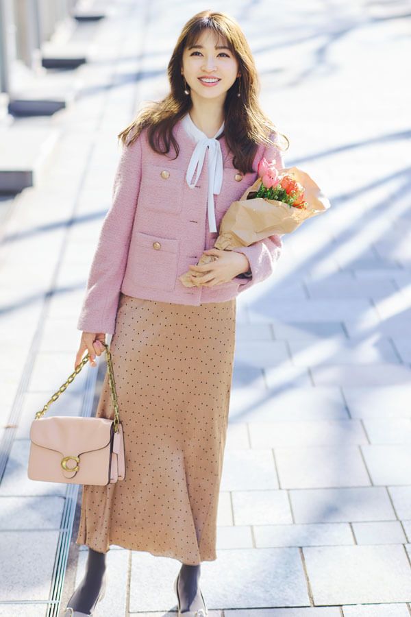 品格溢れるツイード地のジャケットは、この時季の通勤アウターとしても活躍。春先にぴったりなピンクのジャケットから、ブラウスのボウタイをのぞかせて令嬢ライクに。ボトムには小粒のドット柄が上品なスカートを合わせて、可憐な春フェミニンを満喫して♡ 甘い印象になりがちなドット柄スカートは落ち着いた淡いブラウンの光沢生地なら大人な表情に仕上がります。