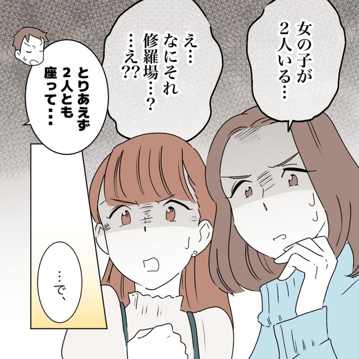 「女の子が2人いる・・」「え・・なにそれ修羅場・・?・・え??」と不審がるアケミさんとケイコさんにカナメさんが「とりあえず2人とも座って・・」と促し、「・・で、」と切り出しました。