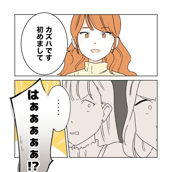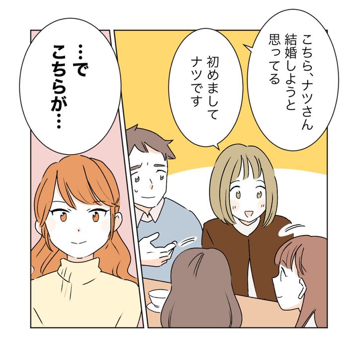 カナメさんが「こちら、ナツさん。結婚しようと思ってる」とまずナツさんを紹介し、「初めまして。ナツです」とナツさんが挨拶。次に「・・で、こちらが・・」とカズハさんを紹介しようとすると、
