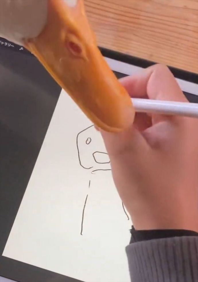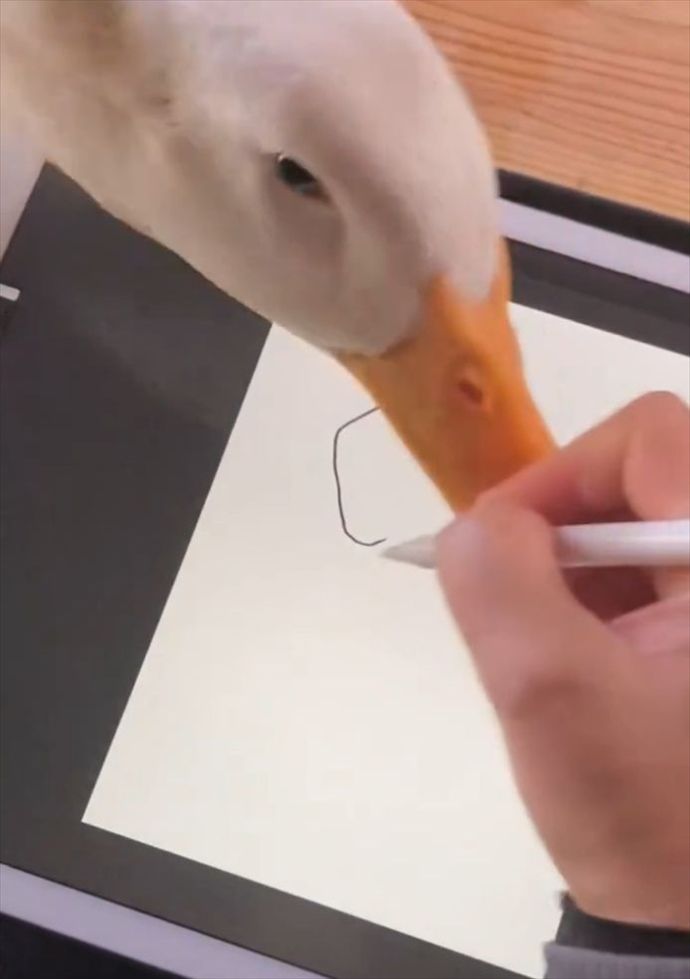 絵を描こうとしている飼い主さんの手元にいるアヒル。 このアヒルは、絵を描くのを阻止するかのように飼い主さんの指を突いていたのです!!
