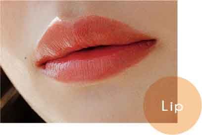 E のリップでぷるぷるジューシーな唇に。少しオーバー気味に仕上げると、ツヤとふっくら感が高まる。