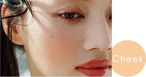 D のチークはスポンジでぼかすとよりツヤっぽい質感がアップ。アイメイクとのバランスで、やや下めにオン。