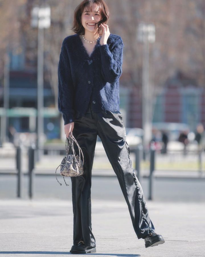 ダークカラーの「カーディガン×黒パンツ」の辛口コーデは、素材や小物を工夫して女っぽさを加えるのが垢抜けのコツです。ニットはふわふわ素材、パンツは光沢感の異素材MIXで、エレガントに昇華して。重たくほっこり見えしがちですが、パールネックレスを投入すればパッと華やかな表情になります。コーデが単調にならないように、キャッチ―なレザーバッグを効かせるのがポイント。