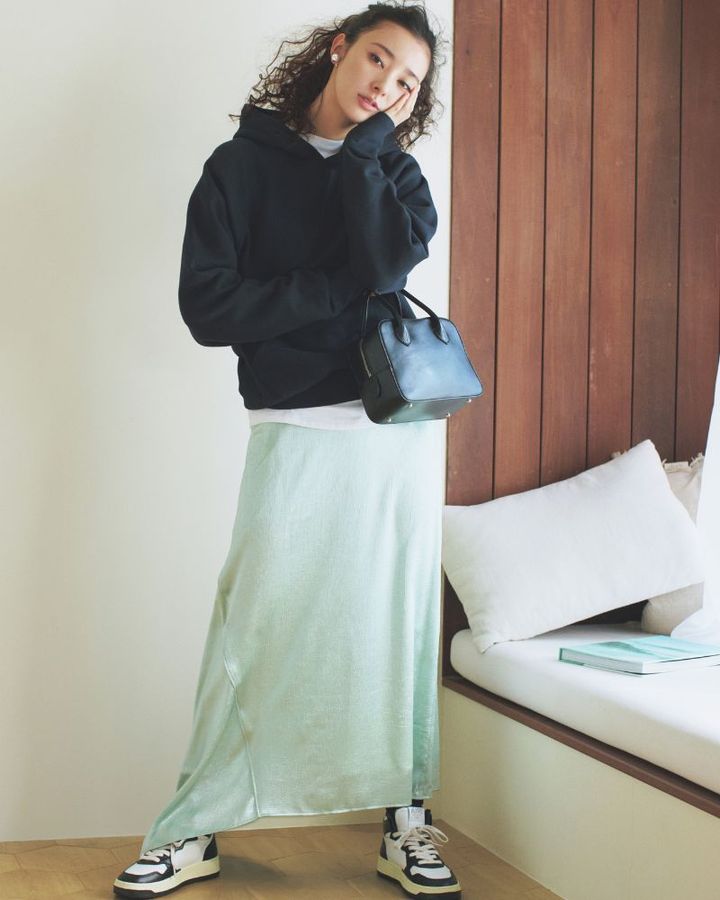 トレンドのフーディやスウェットを今っぽく取り入れるなら、対極するフェミニンな異素材アイテムと組み合わせるのがポイントです。ツヤがかったミントカラーのサテンスカートを合わせれば、甘辛MIXでグッとよそ行きモードに。インナーに白Tを仕込んでレイヤードすると、ちぐはぐなアイテム同士もメリハリができます。ハイテクスニーカーを投入して、スポーティ寄りに仕上げるのが今の気分。