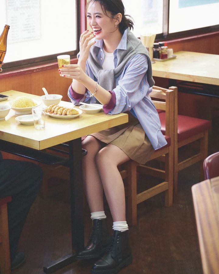 ミニスカート¥17,600(アプワイザー・リッシェ)シャツ¥18,700(マカフィー/トゥモローランド)タンクトップ¥13,200(ボーダーズ アット バルコニー)カーディガン¥39,600(キャバン/キャバン 丸の内店)バッグ¥15,950(ユナイテッドアローズ/ユナイテッドアローズ 渋谷スクランブルスクエア店)ピアス¥2,090(アモネ/サンポークリエイト)ブレスレット¥44,550(too:/シエナロゼ表参道ヒルズ店)ブーツ¥99,000(パラブーツ/パラブーツ青山店)ソックス/スタイリスト私物