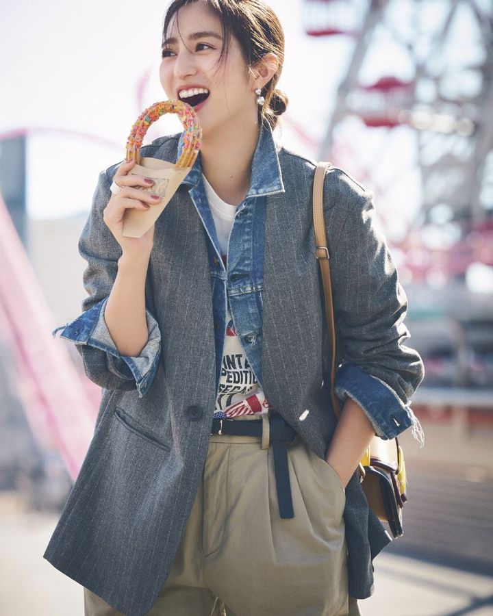 ジャケット¥28,600(MIESROHE/MIESROHE ルミネ新宿1店)デニムジャケット¥88,000(マディソンブルー/マディソンブルー トーキョー)Tシャツ¥17,600(ポロ ラルフ ローレン/ミューズ ドゥ ドゥーズィエム クラス 六本木店)パンツ¥23,100(ティッカ)ベルト¥11,000(レフィエ/フラッパーズ)ピアス¥11,990(ラブ・エージェイ/ZUTTOHOLIC)リング¥13,200(ワンエーアールバイウノアエレ/ウノアエレ ジャパン)バッグ¥157,300(ピエール アルディ/ピエール アルディ 東京)