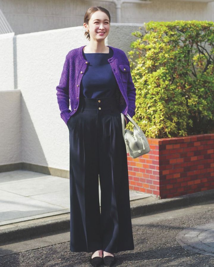 大人がカラーカーデを取り入れるなら、子供見えしないよう全体を上品にまとめて洗練度を意識。挑戦のパープルでもメタリックボタン付きなら、ツイードジャケットのような品格も備わるのでハードルも低くオススメです。トップスは同系色のネイビーと組み合わせれば、大人の色気が漂い好バランスに。落ち感のある黒ワイドパンツを効かせて、コーデを引き締めるのが大切です。
