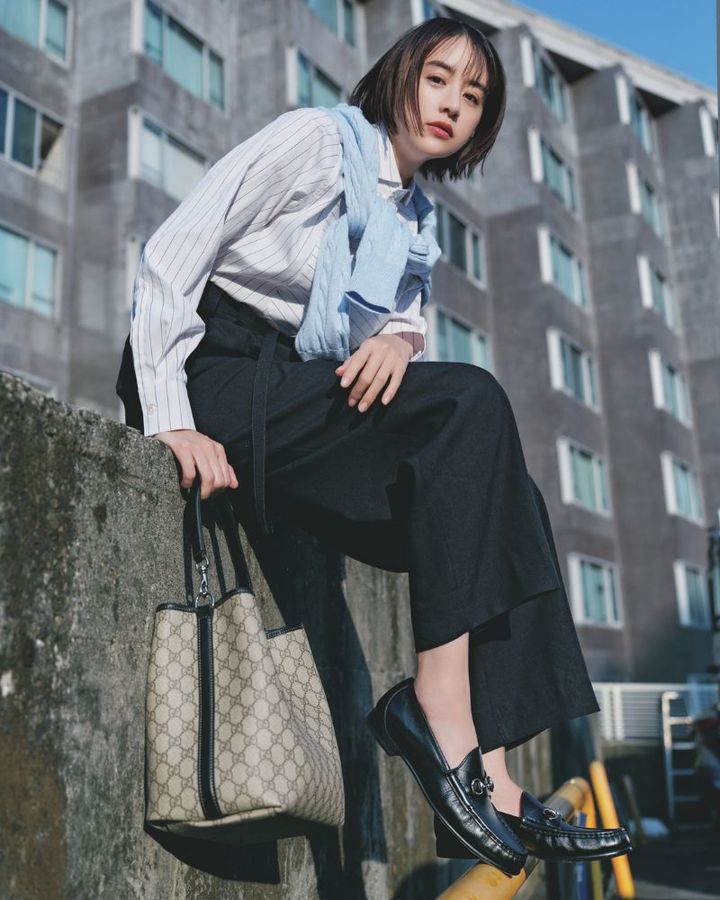 ローファー[H1.5cm]¥152,900バッグ¥309,100(ともにグッチ/グッチ クライアントサービス)ブラウス¥63,800(セブリン/ドゥロワー 青山店)肩に巻いたニット¥22,000(ブルックス ブラザーズ/ブルックス ブラザーズ ジャパン)パンツ¥121,000(コート/メゾン・ディセット)