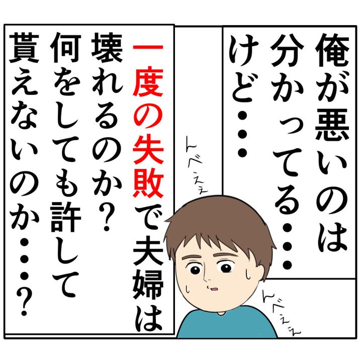 一人残されたろみ緒さんは「俺が悪いのは分かってる・・けど・・一度の失敗で夫婦は壊れるのか?何をしても許してもらえないのか・・?」と、どれだけ歩み寄ろうとしても心を閉ざし続けるめいさんに対し疑問を抱いていました。