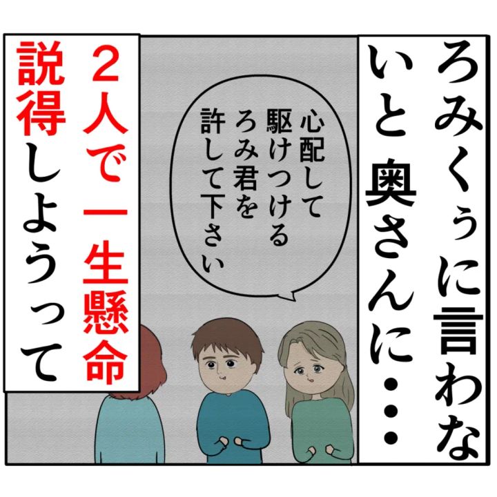 そして、「ろみくぅに言わないと。奥さんに・・『心配して駆けつけるろみ君を許して下さい』って2人で一生懸命説得しようって」と強く思います。