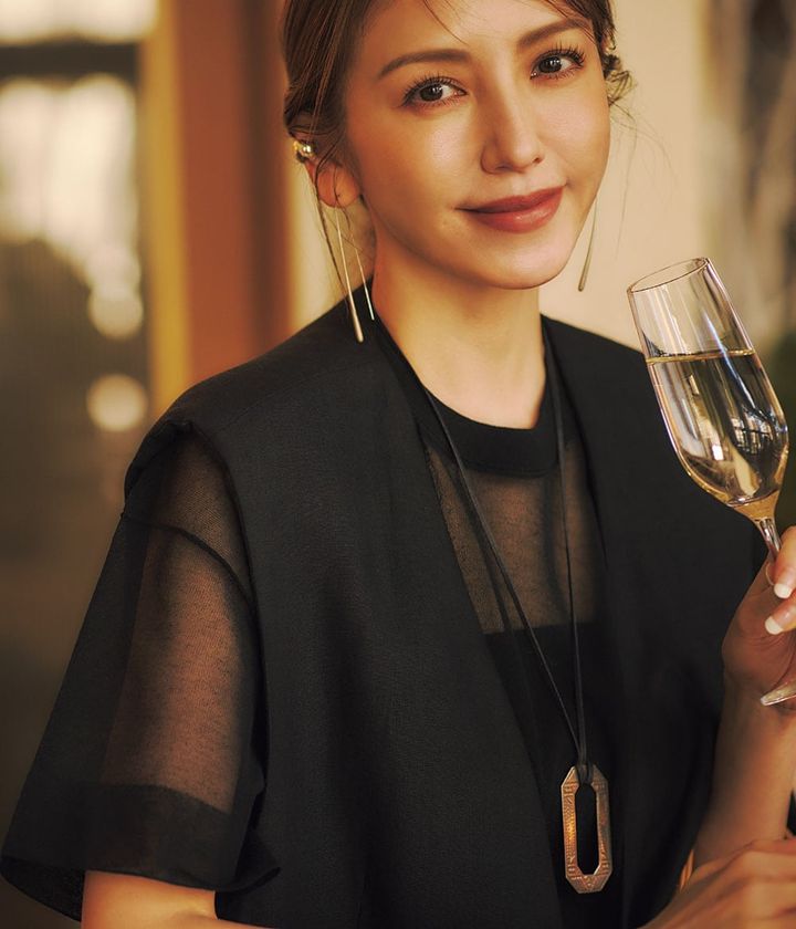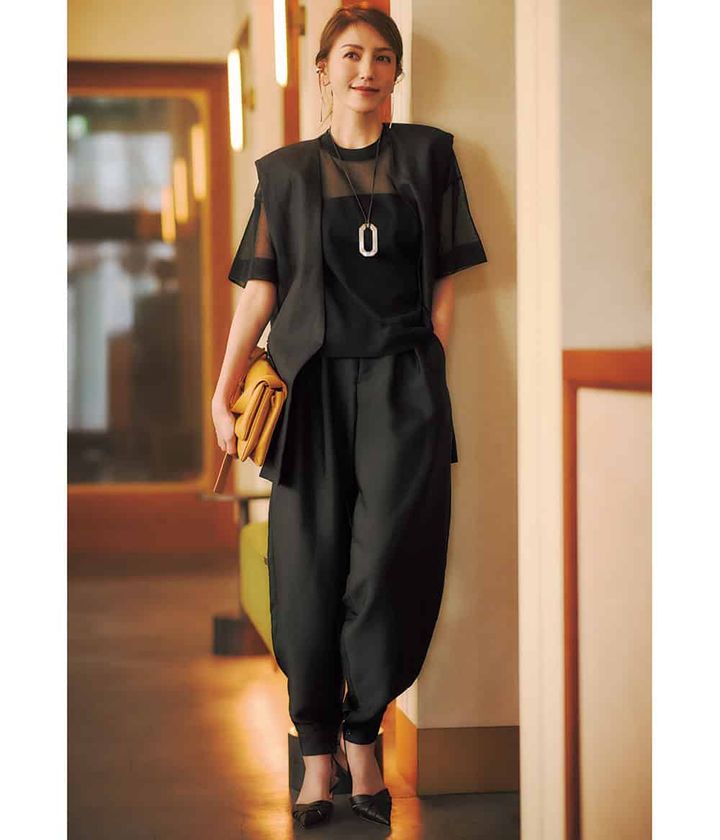 ドラマティックな黒の華やかさが、週の最後の解放感を盛り上げてくれる。シアー、リネン、艶。素材の魅力を重ねてALLブラックに表情を。