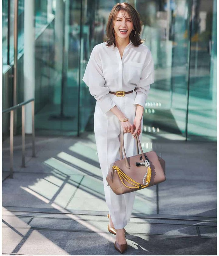 白シャツで気合いを入れつつ、大人の余裕を感じさせるリラクシーな着こなしを。凛としつつエフォートレスな抜け感。