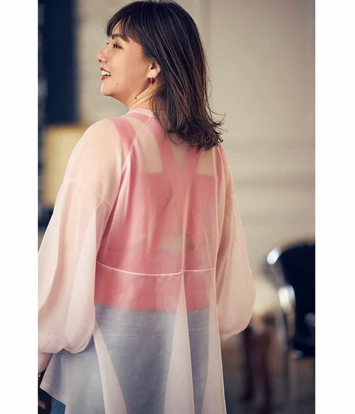前後差のある裾や、ふんわりとボリュームのある袖など、ひとクセあるデザインですが、透け感のおかげで優しく体に馴染みます。シアーの中でも透け感の強い素材なので、バックスタイルに遊び心のあるインナーが映えます。