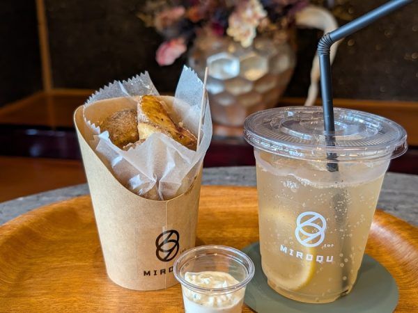 今回は「ウエッジカット」(450円)と「自家製レモネード(炭酸割り)」(550円)を注文。 せっかくなので人気No.1の「サワークリームオニオン」(100円)のディップソースも一緒にチョイス。 イートインスペースは店内の和室、テラス席、隣接しているガレージと色んな雰囲気を楽しめます。