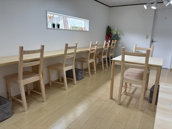 店内は白と木を基調にした明るい店内。カウンター席・テーブル席(2人・4人)×各1があり、1人でもグループでも利用しやすい雰囲気でした。座敷はありませんが、幼児用ハイチェアー(1脚)もありましたよ。