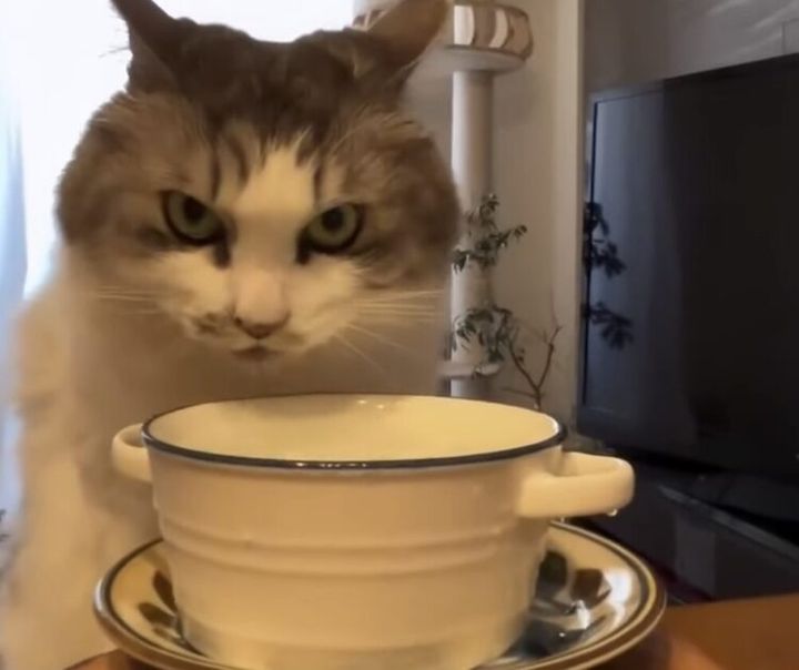 楽しい食卓のはずが? 猫さんの表情がものすごく不満げでした