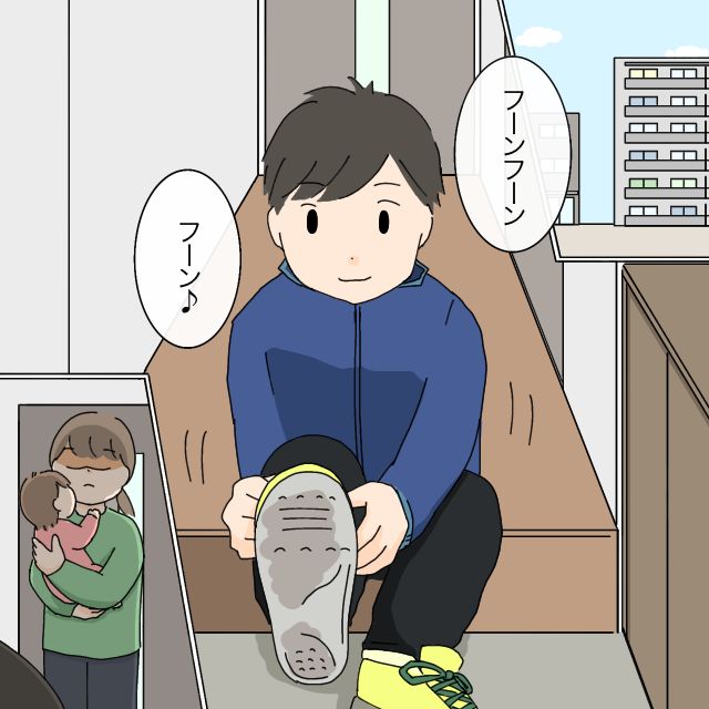 ある日のこと。「フーンフーン、フーン」鼻歌を口ずさみながら、玄関で靴を履いているたかしさんを、あいちゃんを抱っこしたかなえさんが、少し離れたところからじっと見ていました。